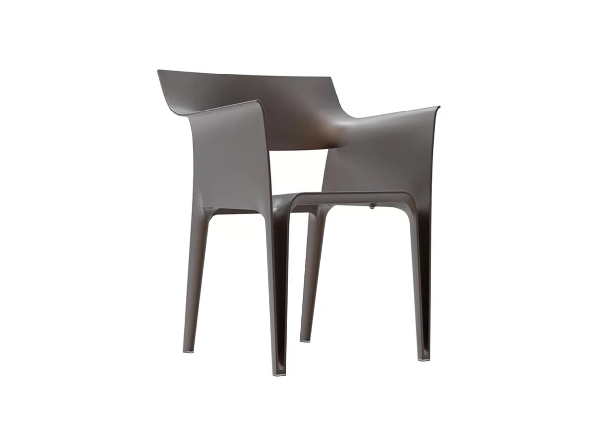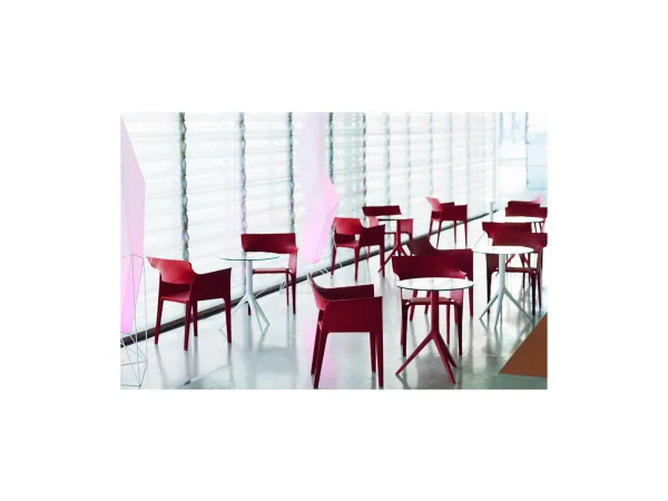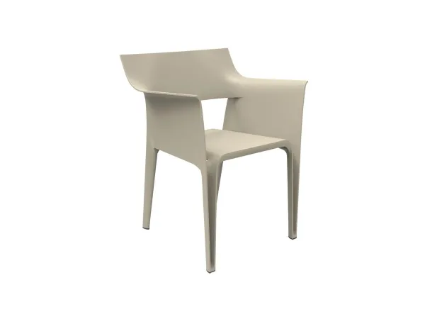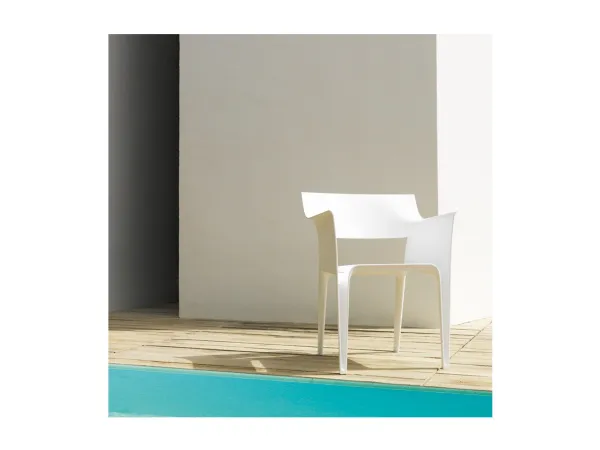 Sedia realizzata in polipropilene. Prodotto ideale per ambienti esterni. Impilabile.