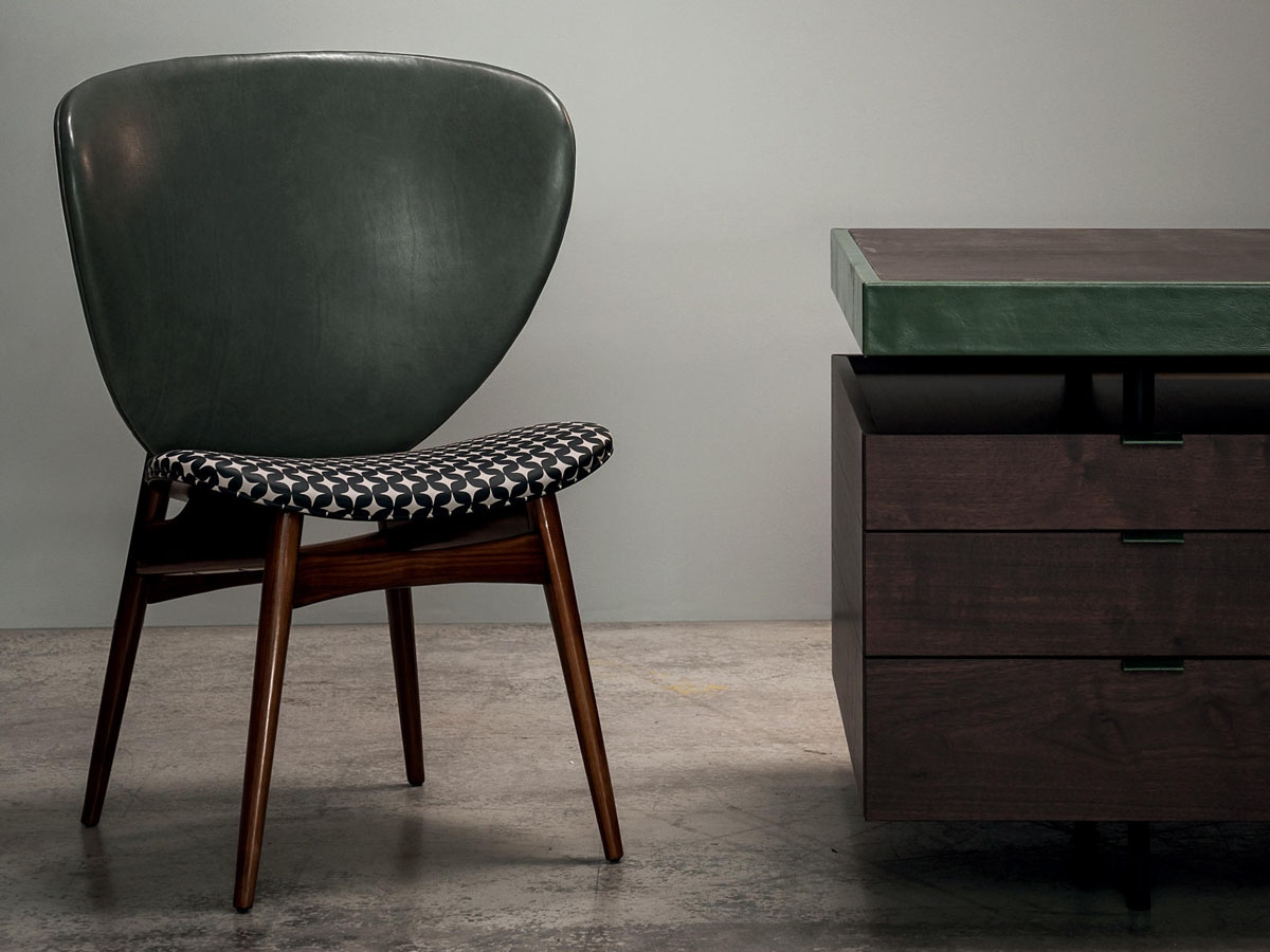 Alma è una sedia che abbina l'eleganza della pelle al calore del legno. La base esile slancia la figura e regala una piacevole sensazione di leggerezza visiva. Su richiesta è possibile abbinare pelli diverse per il rivestimento di seduta e schienale, creando così un mix ancora più accattivante.