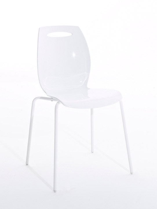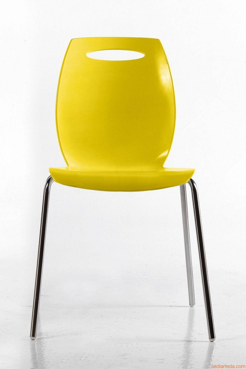 Sedia con struttura in acciaio e seduta realizzata in tecnopolimero. Impilabile.