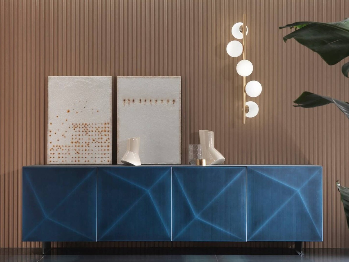 菱形弯曲的金属柜门和柜边,加上上面的菱形装饰,使家具更显精致。柜门采用 45°切割,并配有推拉式开启系统,打开后可看到卡纳莱托胡桃木内饰和透明玻璃搁板,非常适合摆放物品。
