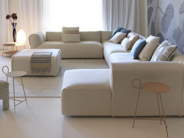 木制框架,带松紧带和填充物,采用不同密度的聚氨酯泡沫。可拆卸织物盖或皮革固定。沙发 Rever 也提供模块化版本。立即联系我们获取自定义布局。