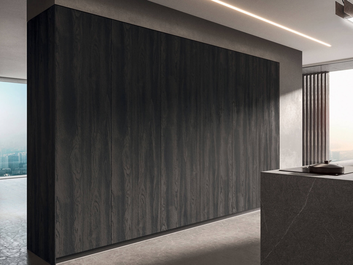 带有缩回门的柱子允许完全自由移动。不同的内部解决方案可满足厨房的所有日常需求。简单快速的门关闭系统使构图能够恢复其独特而基本的线性轮廓,提供完全的优雅。