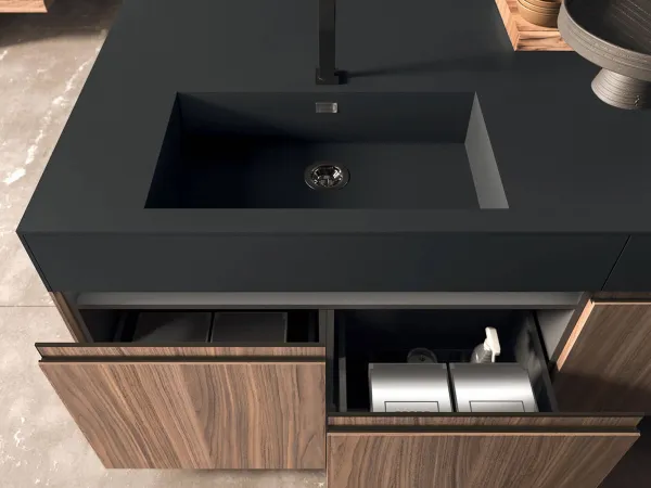 不透明 soft- 触摸厨房岛上的防指纹表面有助于带来令人愉悦的触感。大尺寸的Fenixtop隐藏在内部的舒适和深抽屉。内部抽屉和深抽屉采用专门设计的系统,用于存放餐具、花盆和厨房中通常每天使用的所有其他设备。