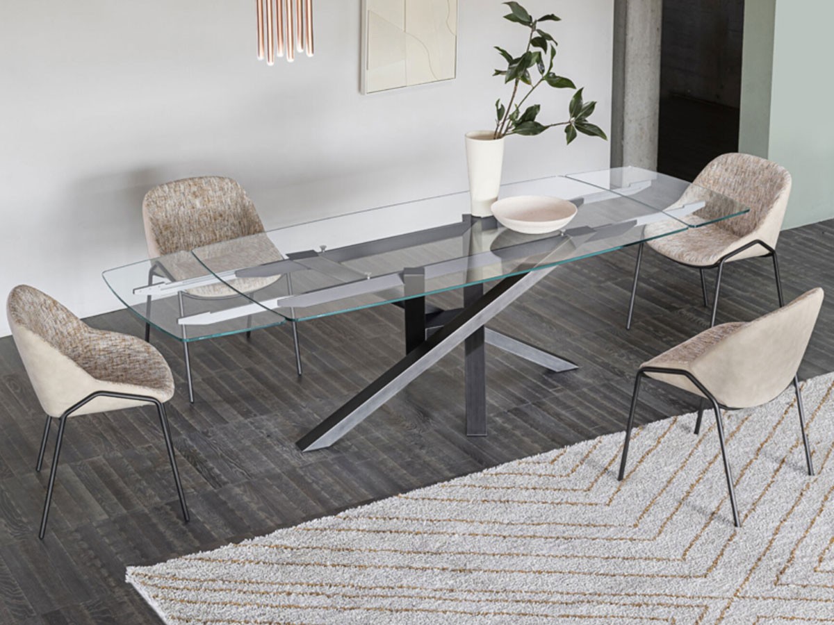 Riflessi 设计的 Shangai 桌是轻盈、透明和精致的完美平衡。其雕塑般的结构由错综交织的桌腿组成,桌腿在底部交叉,营造出一种令人回味的动感和活力。玻璃桌面赋予了桌子优雅和现代的气息,使整体设计更加轻盈和明亮。尚艾桌有固定式和可伸缩式两种款式,可适应任何环境的空间和功能要求。其形状从圆形到长方形,再到椭圆形和圆桶形,您可以根据家具的风格进行定制。
