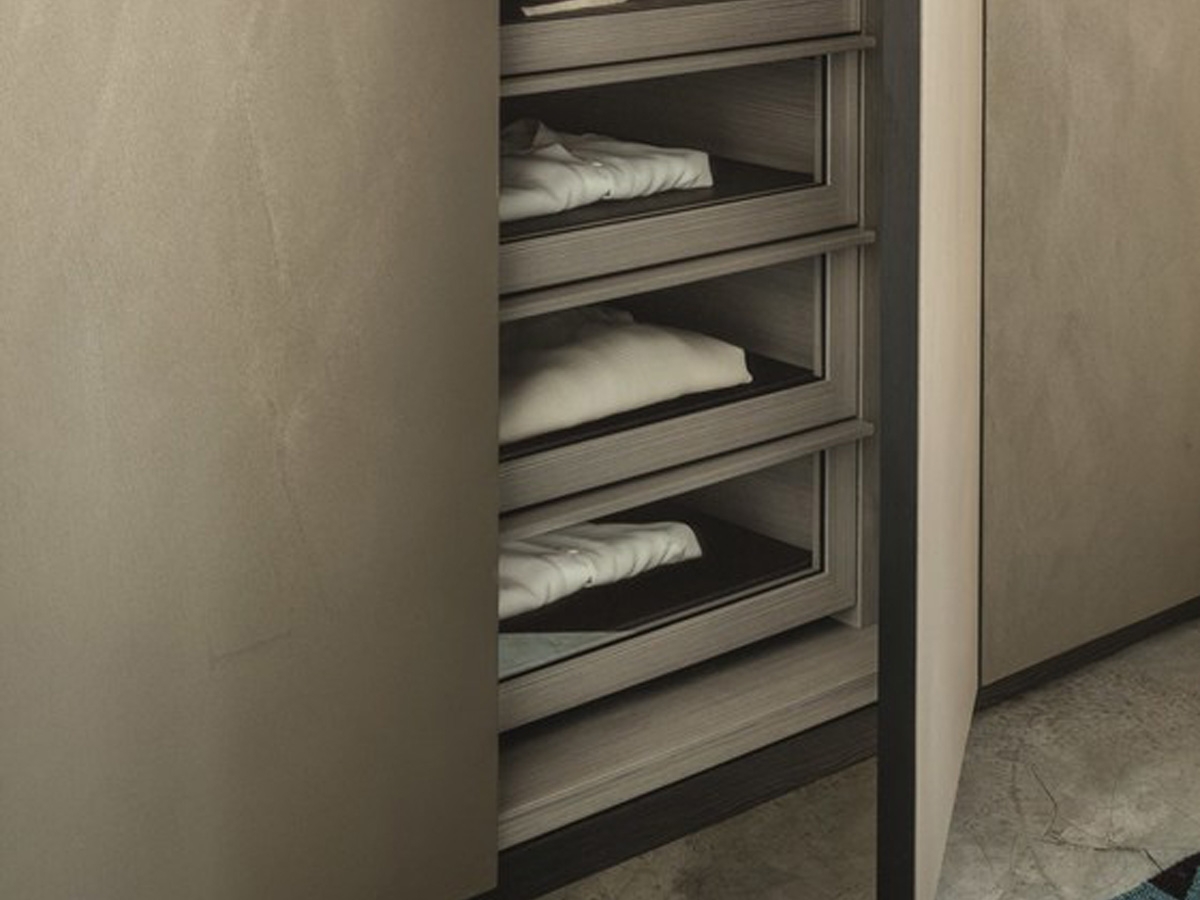 手柄也可以定制为青铜或漆色,与门相匹配。广泛的内部设备提供多种组合,以满足任何订单需求:抽屉单元,裤子,皮带和鞋子的显示 cases 。搁板和挂杆内置 light。不要忘记皮革和织物中的珍贵细节,例如抽屉垫子和衬衫隔间的盒子。建议使用铰链式或滑动门,有不同的饰面和尺寸。
